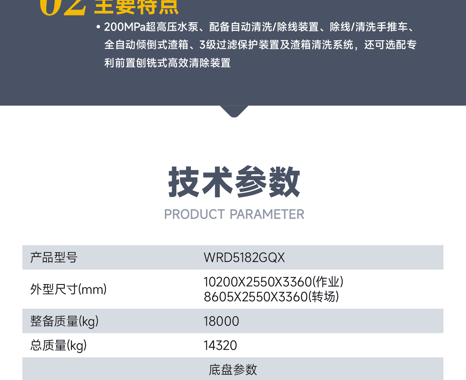 主要特點:200MPa超高壓水泵、配備自動清洗/除線裝置、除線/清洗手推車、全自動傾倒式渣箱、3級過濾保護裝置及渣箱清洗系統