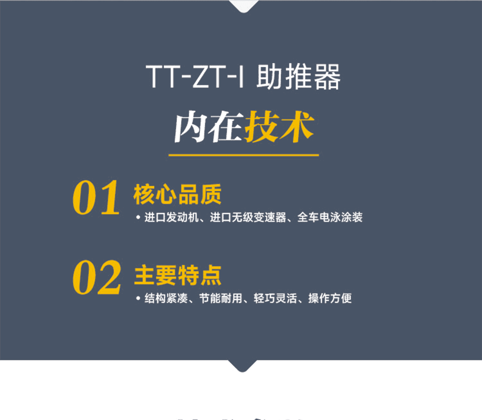 核心品質:進口發動機、進口無級變速器、全車電泳涂裝。主要特點:結構緊湊、節能耐用、輕巧靈活、操作方便