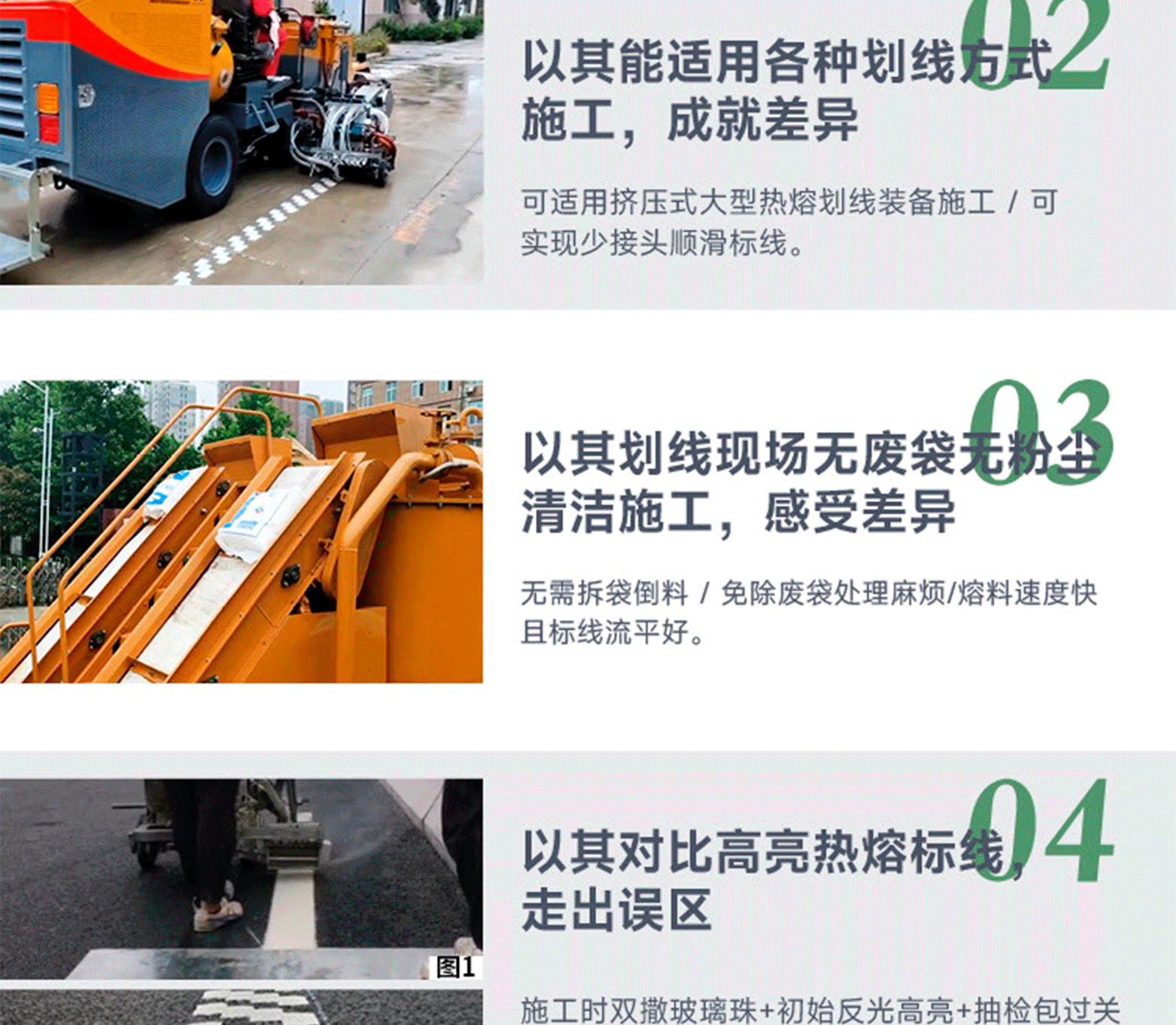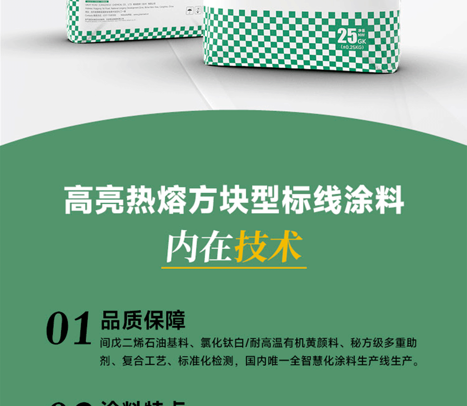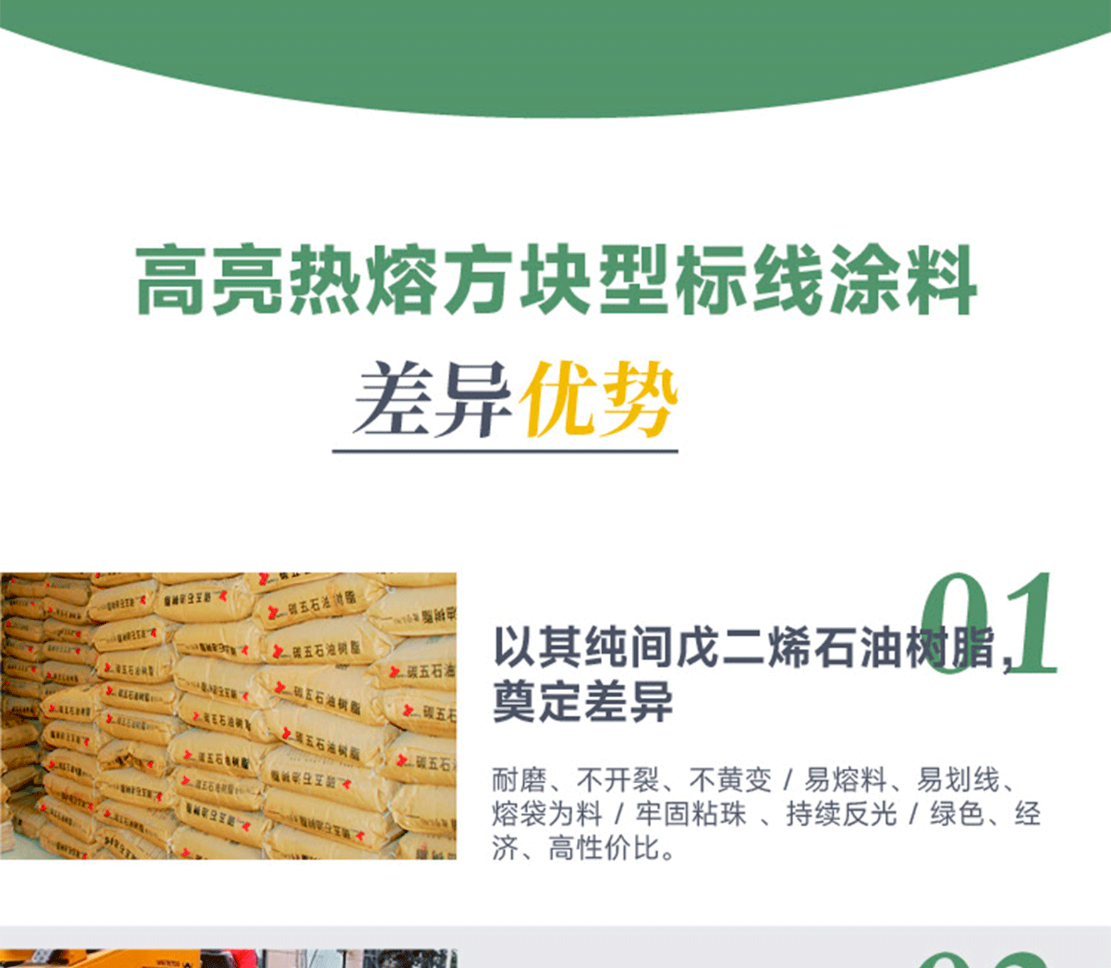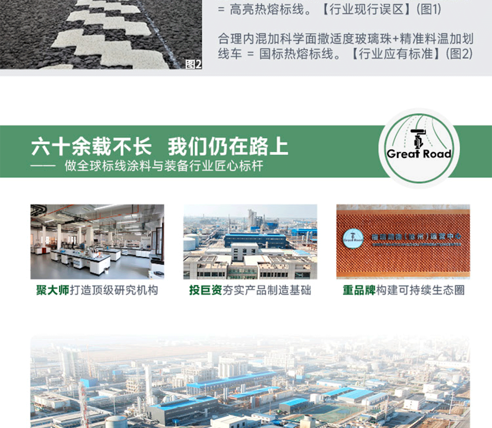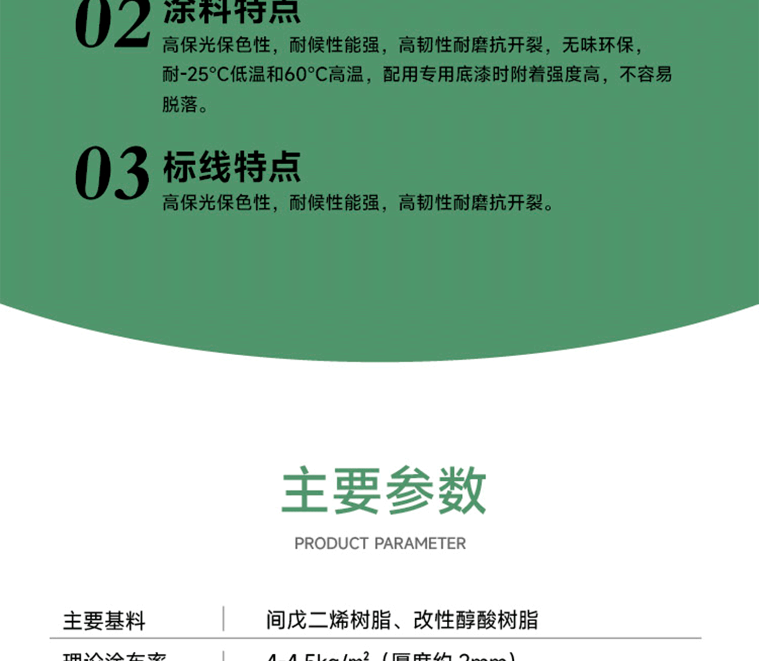 涂料特點:高保光保色性,耐候性能強,高韌性耐磨抗開裂,無味環(huán)保,耐-25℃低溫和60℃高溫。標(biāo)線特點:高保光保色性,耐候性能強,高韌性耐磨抗開裂。