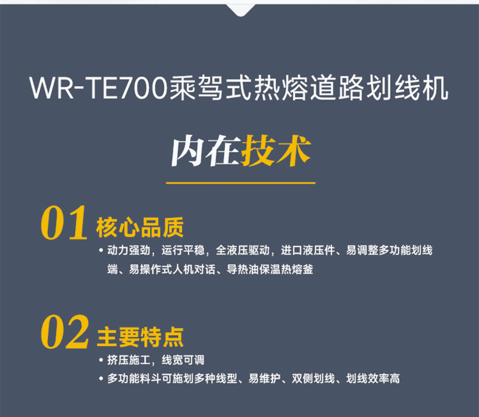 ?專家測評:核心品質: 動力強勁,運行平穩,全液壓驅動,進口液壓件、易調整多功能劃線端、易操作式人機對話、導熱油保溫熱熔釜。主要特點:擠壓施工,線寬可調;多功能料斗可施劃多種線型、易維護、雙側劃線、劃線效率高