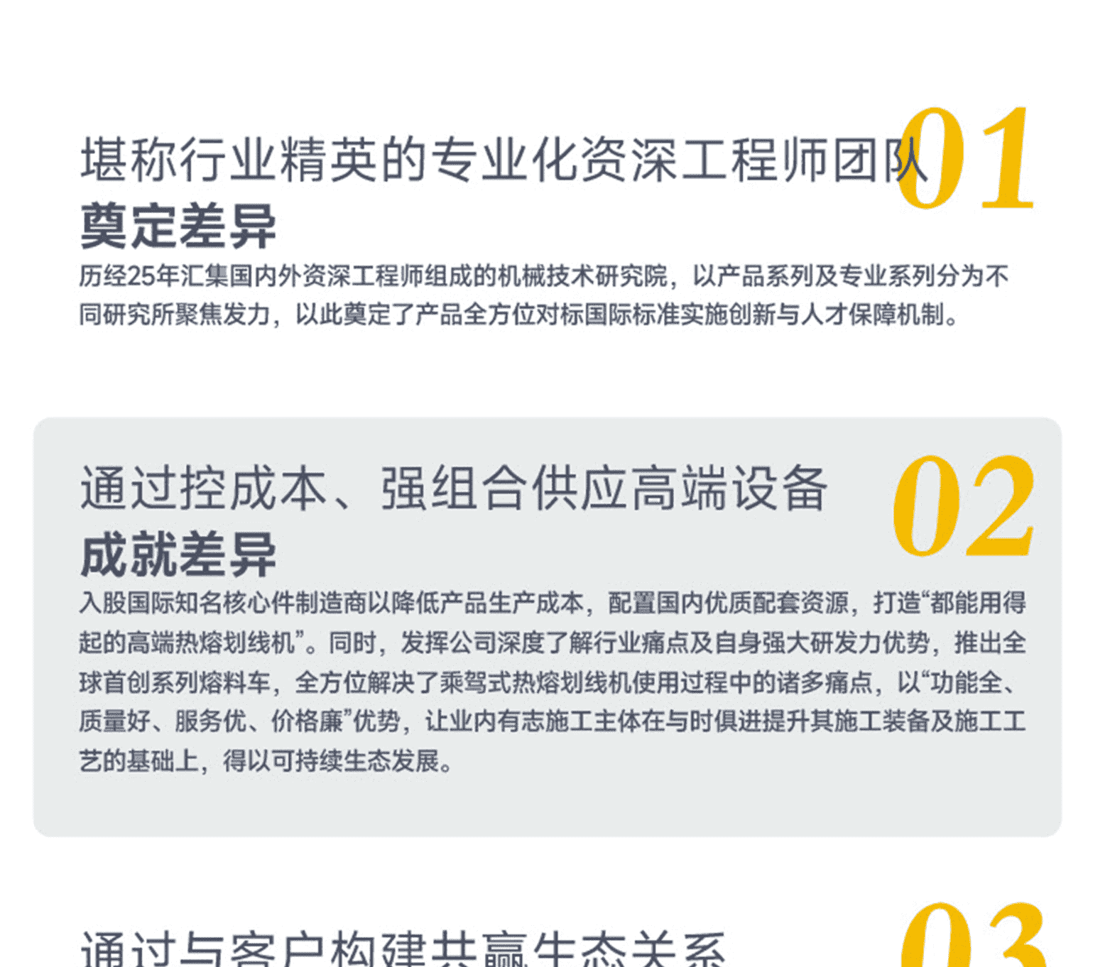 核心品質:驅動系統穩定易操作、進口液壓件、易操作式人機對話、熱熔釜導熱油式穩定保溫;主要特點:刮敷施劃熱熔平線及震蕩線、擠壓施劃平線、劃線端更換方便、易維護、劃線效率高;