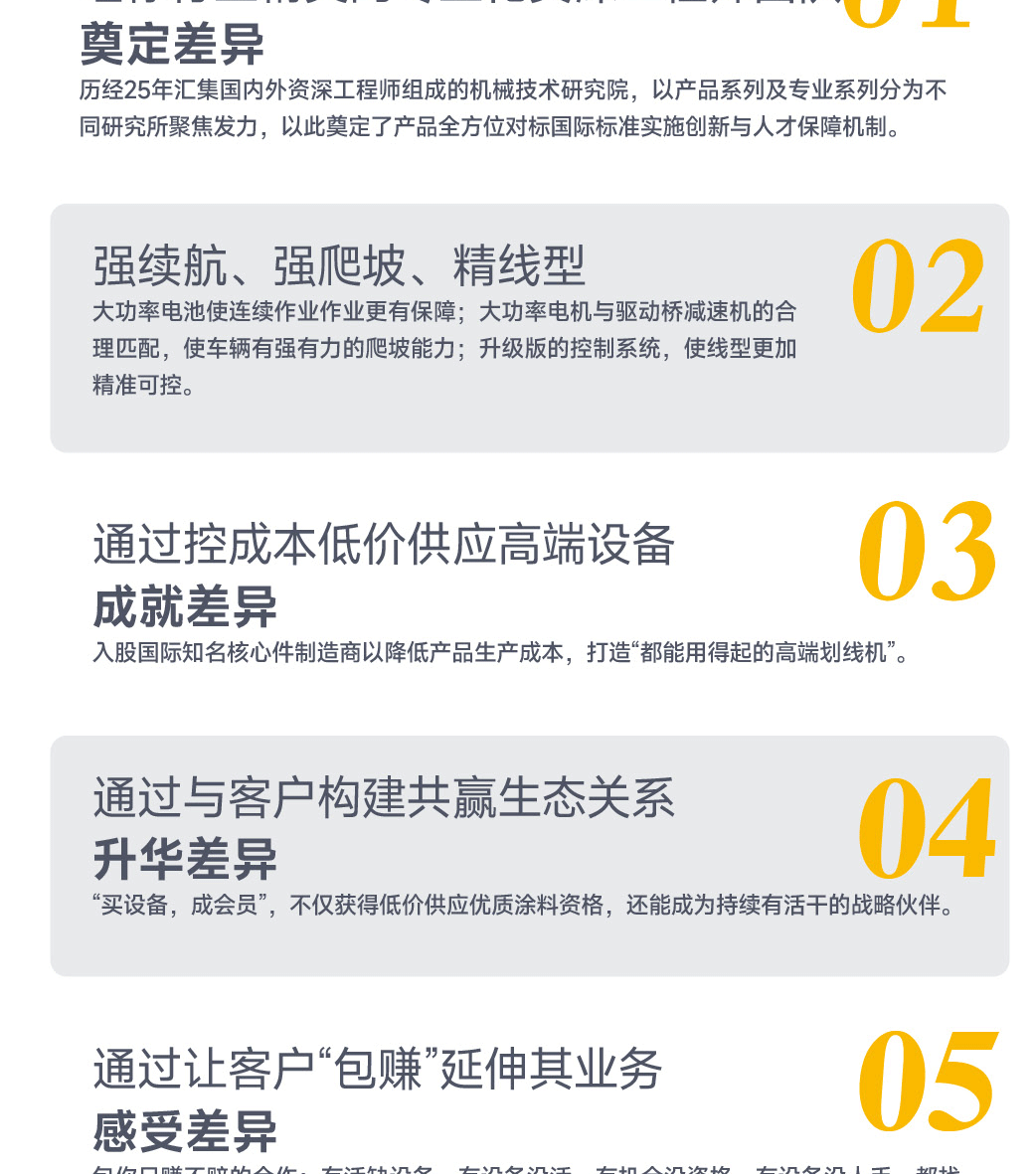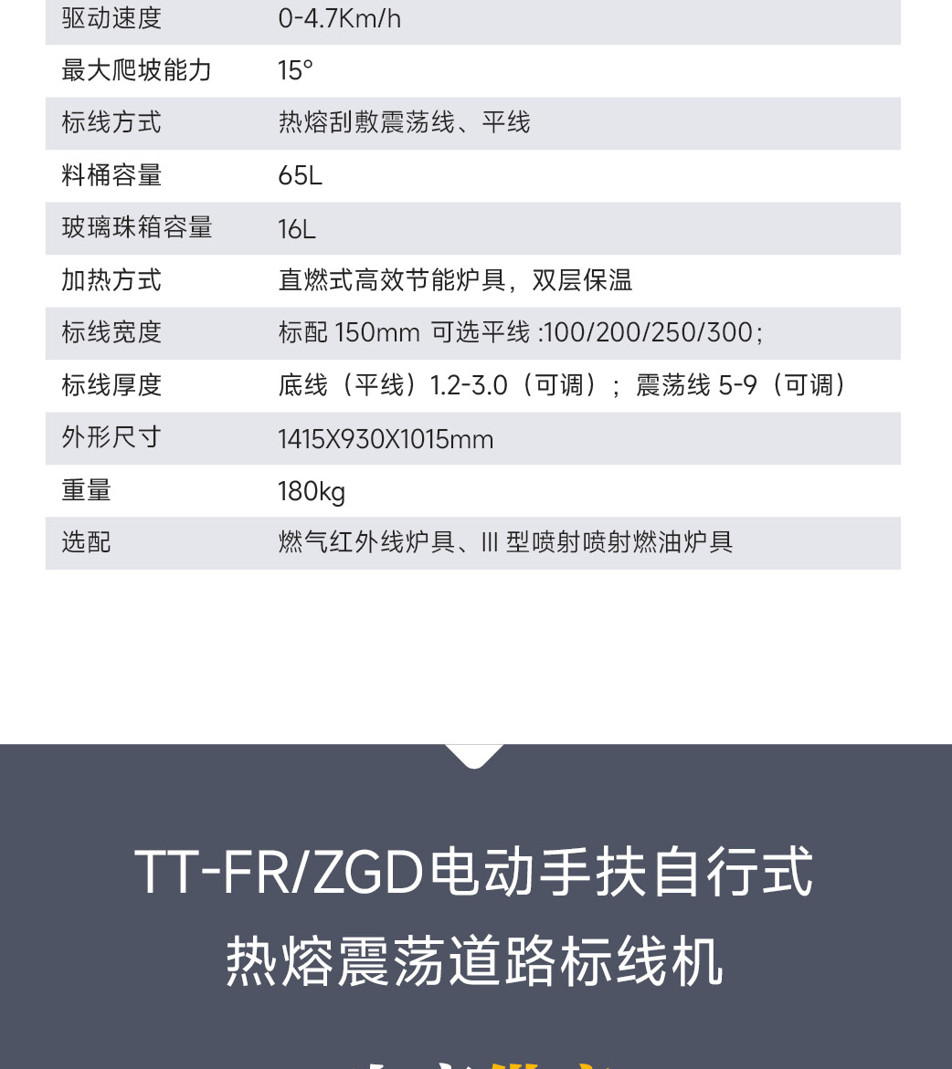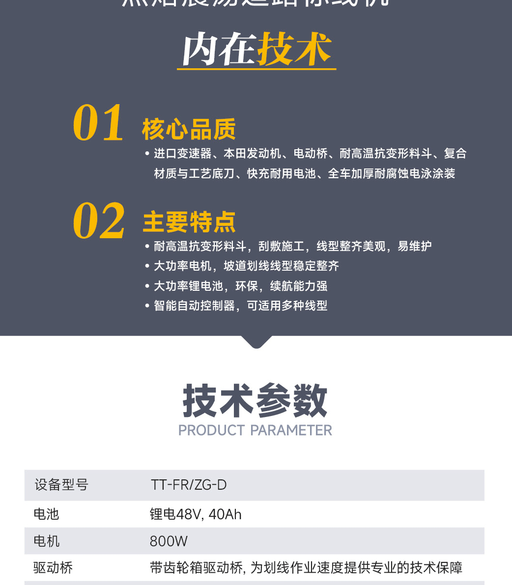 主要特點:耐高溫抗變形料斗,刮敷施工,線型整齊美觀,易維護。大功率電機,坡道劃線線型穩定整齊。大功率鋰電池,環保,續航能力強。智能自動控制器,可適用多種線型