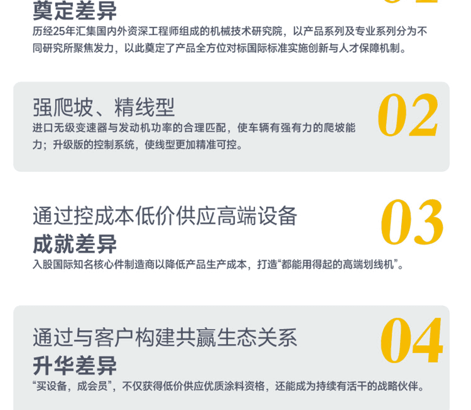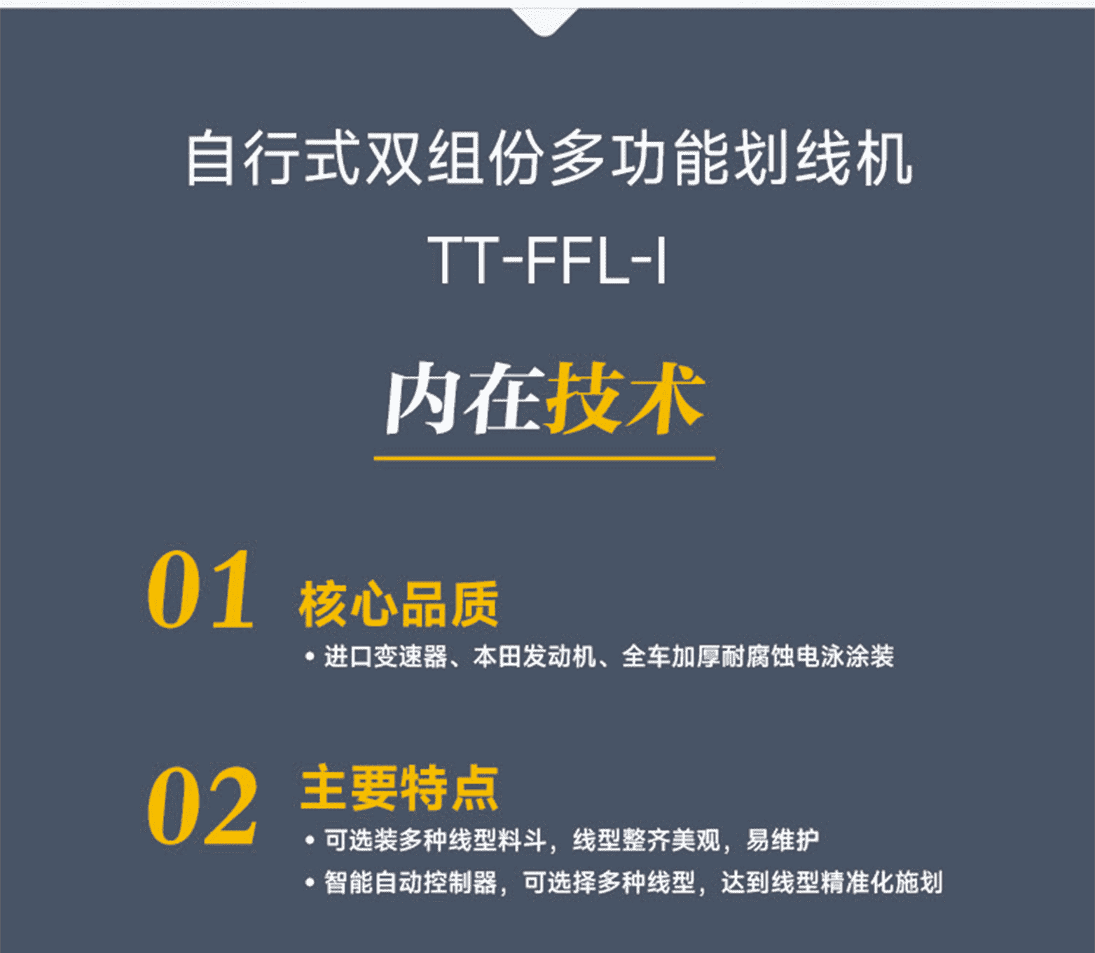 核心品質:進口變速器、本田發動機、全車加厚耐腐蝕電泳涂裝。主要特點:可選裝多種線型料斗,線型整齊美觀,易維護。智能自動控制器,可選擇多種線型,達到線型精準化施劃