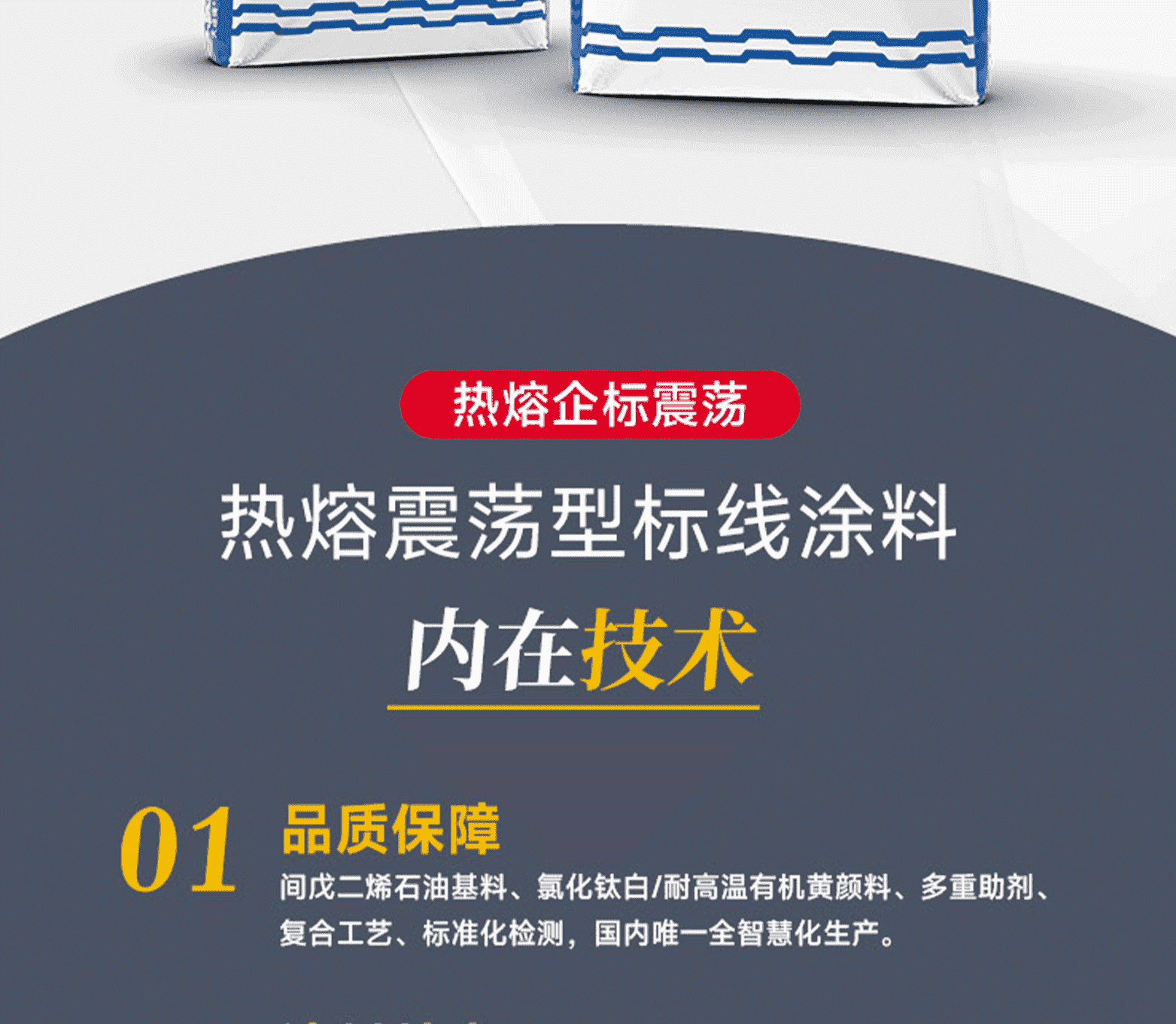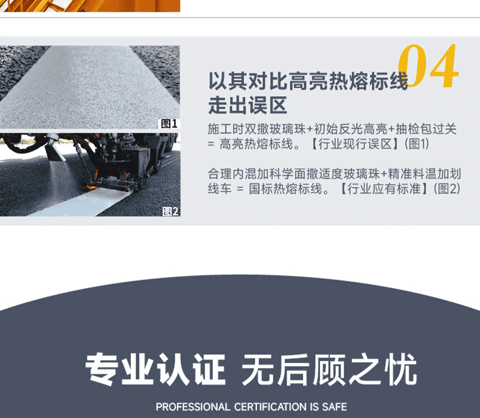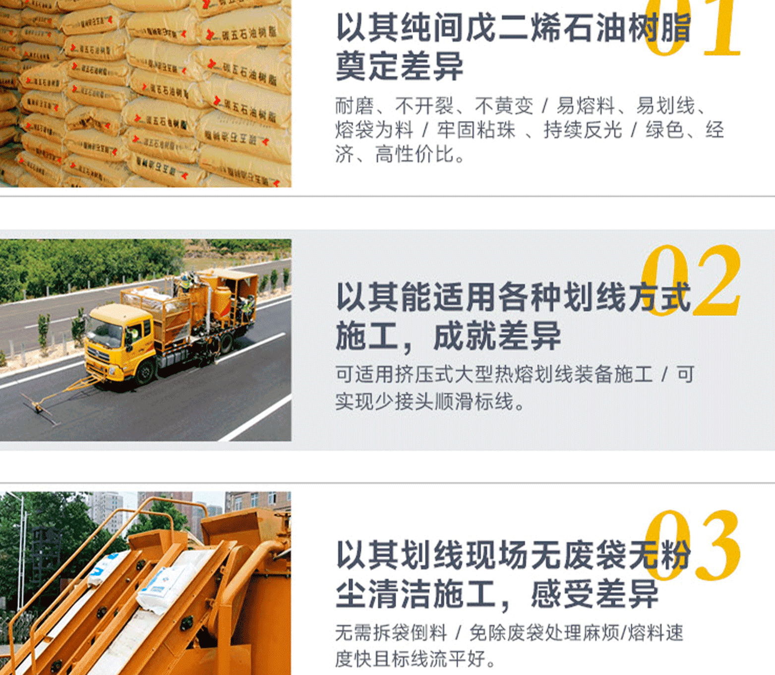 涂料特點:結構合理、混合均勻、質量一致性高 / 玻璃珠含量少 / 用途廣泛,使用方便。標線特點:表面平滑顏色鮮艷;密實耐磨反光好;不龜裂、不黃變,質量免檢;