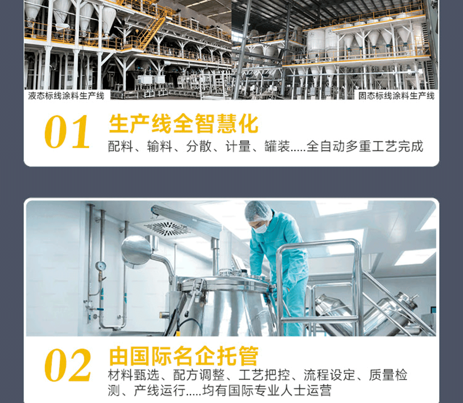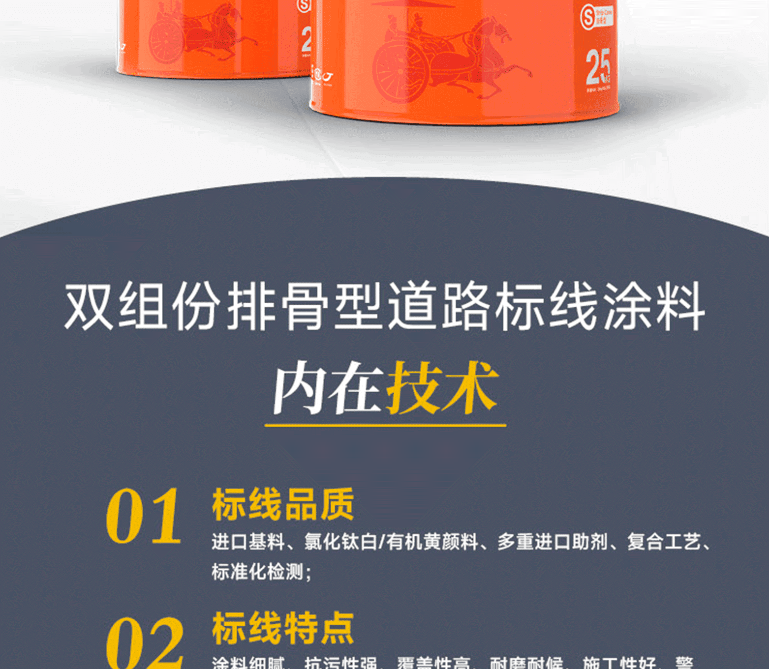 標線品質:進口基料、氯化鈦白/有機黃顏料、多重進口助劑、復合工藝、標準化檢測;標線特點:涂料細膩、抗污性強、覆蓋性高、耐磨耐候、施工性好、抗沉不起泡;